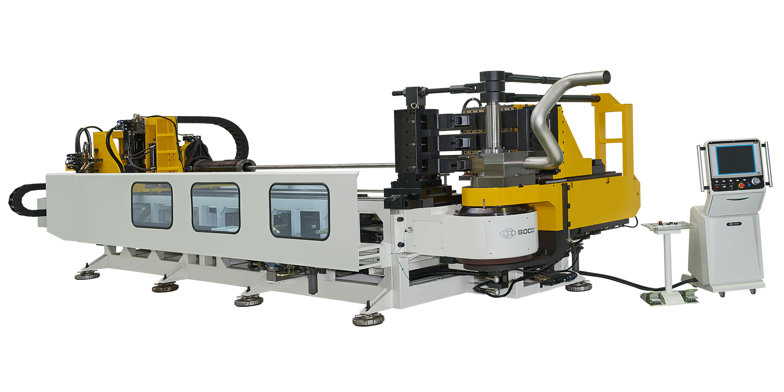 SOCO CNC 6B Serisi Boru Bükme Makineleri, Ø 168 mm’ye kadar boru bükme kapasitesi ile otomotiv, kamyon, otobüs, kazan (boiler), gemi inşa ve diğer ağır sanayi uygulamaları için yüksek güç ve hassasiyet sunar.